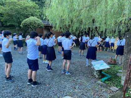 扇芳閣の最上階には『めだかの学校』という自然豊かで、鳥羽湾が一望できる広場があります。朝のつどいは、そこで実施しました。