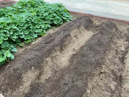 奥の畝は、サツマイモです。収穫が近いです。楽しみですね。