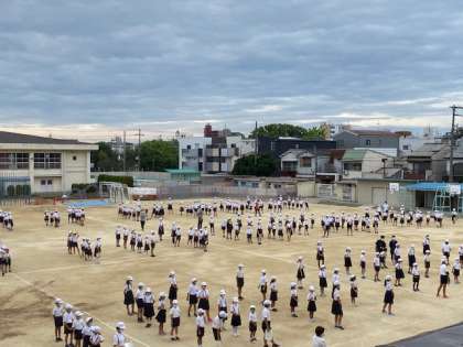 運動委員会主催で、運動場で「大なわ集会」を実施しました。たてわりなかよしグループでフォローしあいながら、8の字や波くぐりで汗を流しました。