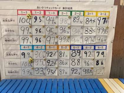 先日のあいさつ週間の結果が発表されました。どのクラスも自己評価が高く、しっかりがんばったようです。続けてほしいです(^O^)