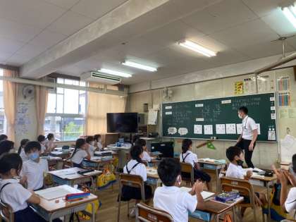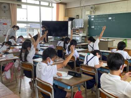 廊下から参観しやすいように、窓枠を外し、エアコンと扇風機の併用で暑さ回避しつつ実施しました。