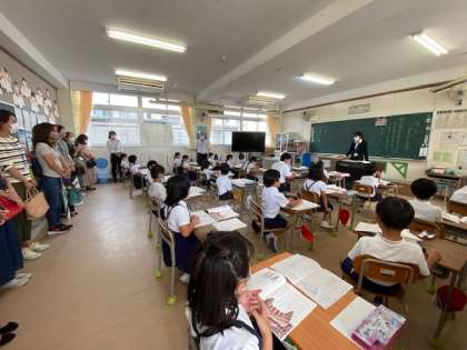 2年生は、1組が算数、2組が国語の様子を参観していただきました。2年生の教室は、耐震化工事をしなくていい教室です。だから窓枠は外れません。他の学年より見えにくかったと思います。