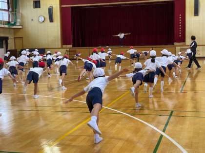 通りかかったので「写真を撮ろう」と講堂に入るとちょうどストレッチをしているところでした。見本を見せている小川先生の体の柔らかいこと! 河野だと、足がまずつかめませんね(笑) 津村先生や笠井先生も無理そうでした(笑)子ども達は、果敢にチャレンジしていました(^O^)