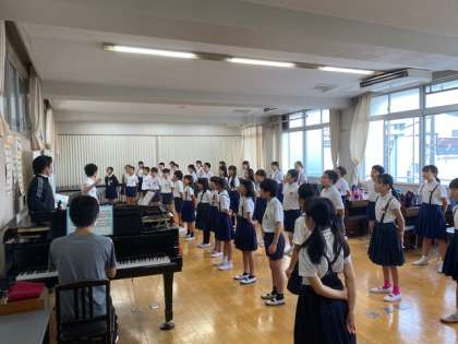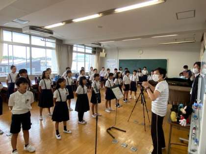 先日来、相島先生の指導の下、校歌の練習が進み、きれいな頭声発声で歌えるようになってきていました。そして、映像・レコーディング班は、校長先生、中野先生、津村先生が中心になって準備をしていました。レコーディング関係は校長先生の腕はプロ級です(^O^) 今日も、「テイク1」「テイク2」でやっていくよ!と子どものモチベーションを上げつつ、助言してくださいました。