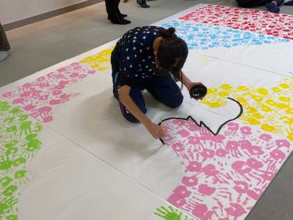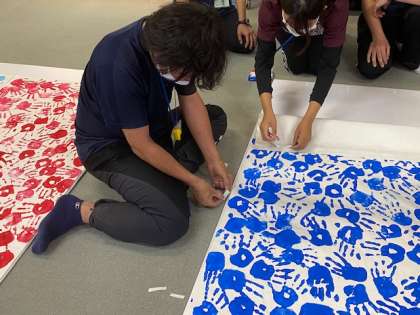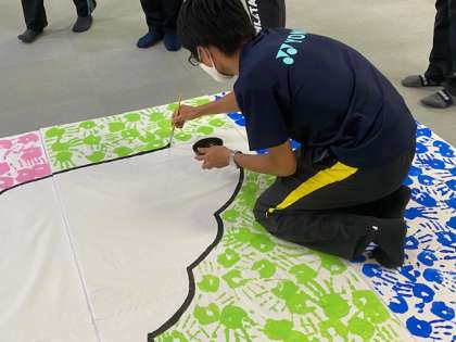 鷹合の校章の形に沿って、図工主任の永井先生が黒のポスターカラーで鷹のマークを描いていきます。途中、津村先生も手伝いました。