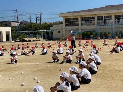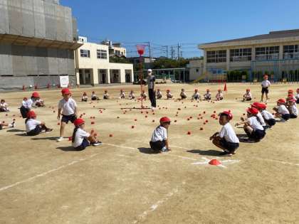 1年生の玉入れの様子です。通りかかったので「10以上の数が読めるかな?」と声をかけると、「…10、11、12、…20、21、22、…33、34、35…」とドンドン言えてます。すごいね〜!とほめたのですが、玉のかごから出している数と唱えている数が合わないので…(;^_^A