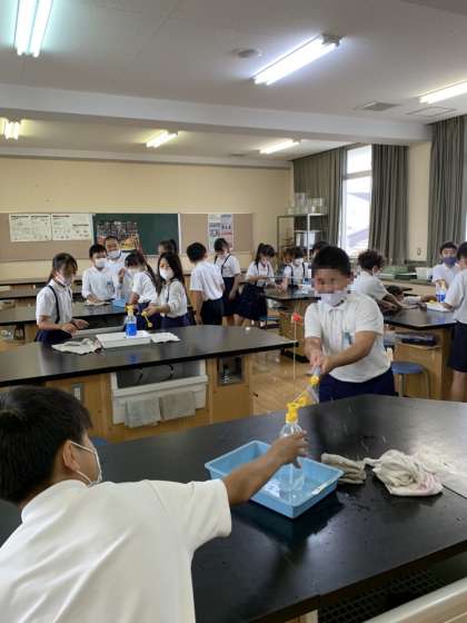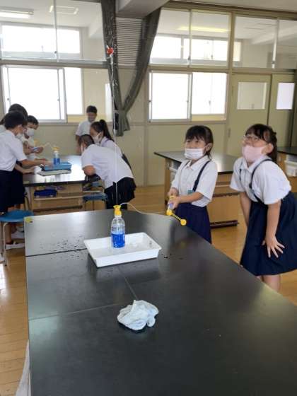 4年生の理科「とじこめた空気や水」の実験の様子です。