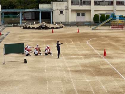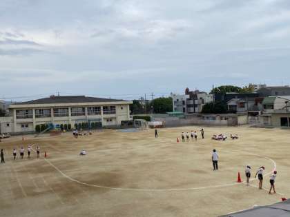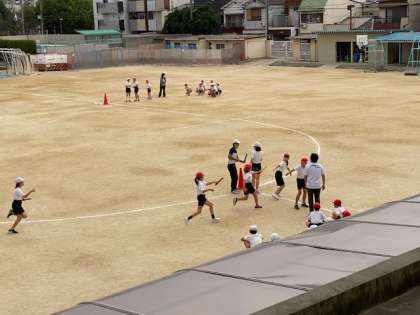 去年までや、体育の時間にしていたリレーとはやり方が違います。子どもたちに説明し、実際に分かれてやってみる、という流れでの指導の様子を職員室前から、校長先生と見ていました。