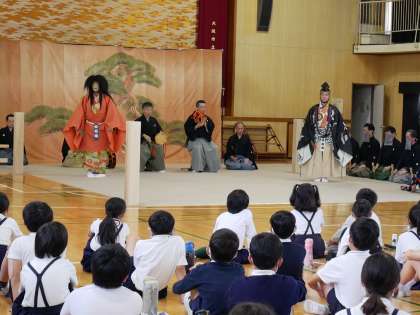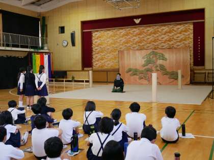 いよいよ本公演。狂言「柿山伏」、能「小鍛冶」を鑑賞しました。舞、笛、太鼓、謡(うたい)などのプロの能楽師による本格的な実演に、児童たちは伝統芸能の世界に引き込まれている様子。最後に質問コーナーや狂言体験ワークショップもあり、日本の文化を身近に感じる体験学習となりました。