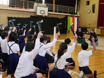 鷹合小学校の体育館が美しい能舞台に変身しました。解説の後、ワークショップでは能の小道具、刀と槌を作って動きの体験をしましたが、みんな真剣な表情で取り組んでいました。
