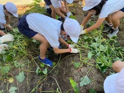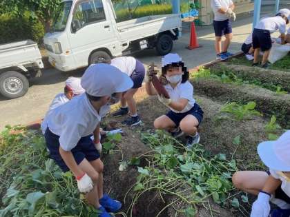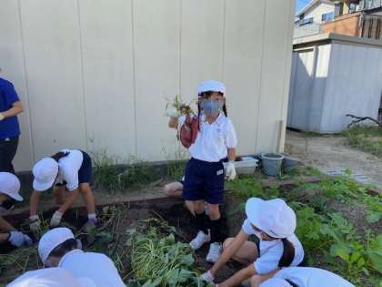 2年生が育ててきた「サツマイモ」。いい感じに育ったイモが土から見えだしていました(^^)/