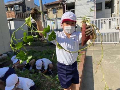 そして、おおきなザルいっぱいに収穫できたサツマイモを、みんなで見て…