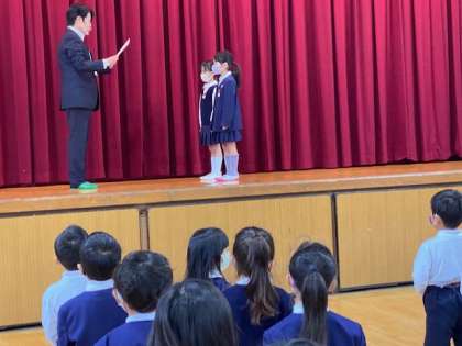 今日の朝会は、はじめに表彰がありました。夏休みの自由課題で描いた「自転車の絵」で賞をもらった児童が、校長先生から紹介され、賞状と副賞をいただきました。