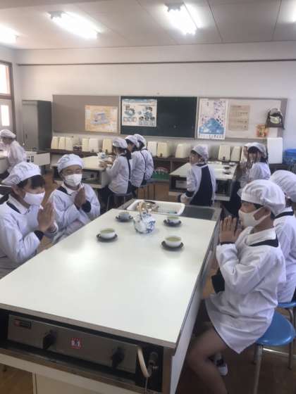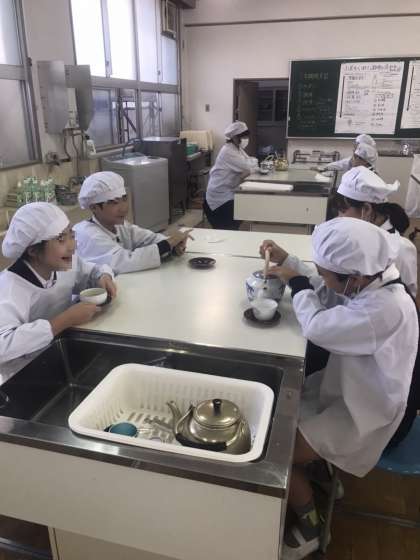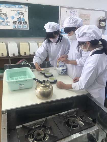 家庭科の調理実習「お茶の入れ方」の学習をしました。「ガスコンロの安全な使い方」と、きゅうすを使った煎茶の入れ方を学びました。お茶の葉の量、お湯の温度、そそぐときは少しずつ茶碗に入れる、などの注意事項を守りながら、実習しました。
