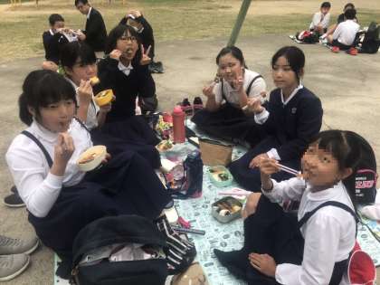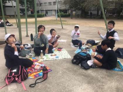 公共交通機関を利用した校外学習への規制が緩和されてから、外でお弁当を食べることができたのは、5年生が初めてです。予想されていた雨も、降り出しが遅れていたので、新聞社前の公園でお弁当を食べることができました。