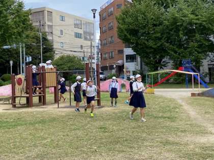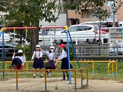 2組は、あとから学校を出発しました。1組が、見学している間、先に公園で遊んだりお弁当をいただいたりしました。