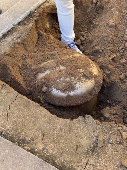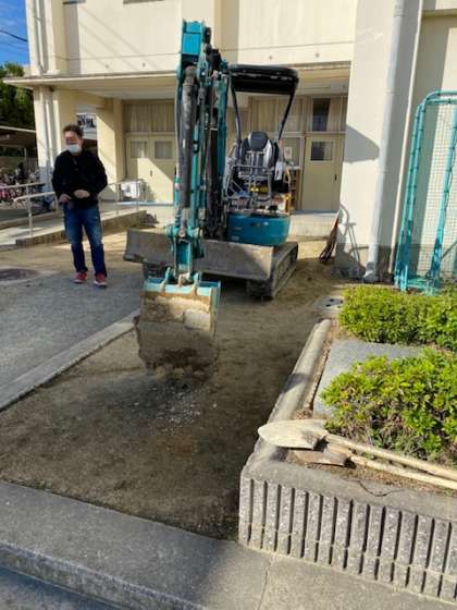「20年後への伝言」という言葉が刻まれている石碑プレートは、生涯学習ルーム前の植え込みにあります。事業委員の方々や校長先生、PTA役員の方々が見守る中、重機で掘り起こしてくださいました。