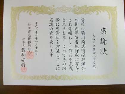 今日の朝会で、年賀看板の話と感謝状の贈呈がありました。