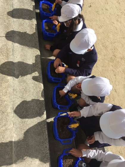 1年生は生活科の学習で、チューリップの球根を植えました。