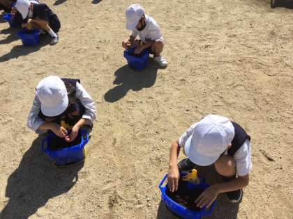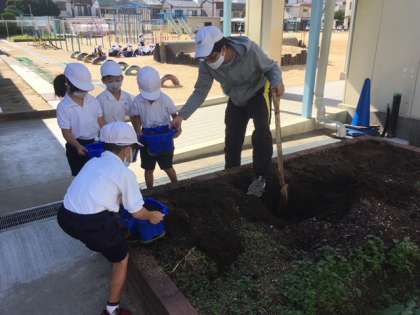 土の中に球根を入れて、やさしく土をかけていました。明日から毎朝水やりですね。チューリップの花が咲くころには、2年生のお兄さんお姉さんですね。