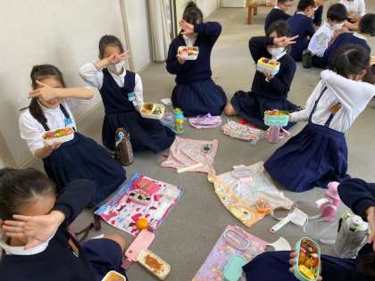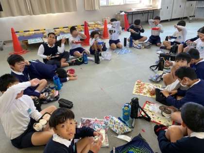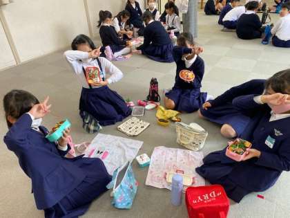学校に帰ってきてから、お弁当をいただきました。多目的室で、輪になって。みんな笑顔、笑顔。かなり歩いたので、おなかはペコペコだったようです。