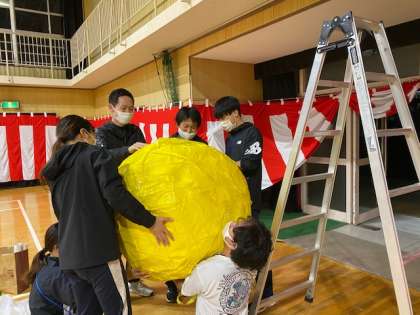 昨夜、講堂が保安灯だけが点いていた意味がわかりました。くす玉を割るときに雰囲気を盛り上げるための演出だったようです。スポットライトを当てて、カウントダウンで割れる…予定です。