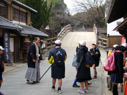 映画村では、昔の街並みのセットや大道芸、ちゃんばら辻指南などを見学しました。
