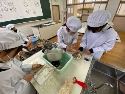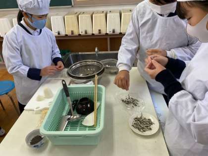 5年生は、鷹合米をブレンドしたお米を炊いたご飯と、油揚げ・わかめ、そして大原農園の「田辺大根」を具材としてお味噌汁の調理実習をしました。