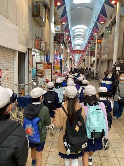 針中野からは、駒川商店街を通って、「街中の冬」を発見しながら帰りました。クリスマスツリーの装飾や、冬物衣料、ミカンに大根、りんごなどの冬の食材…。いろいろ発見できたでしょうか。