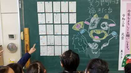 みんなで、できあがった年賀状を黒板に貼って、見合いっこをしました。