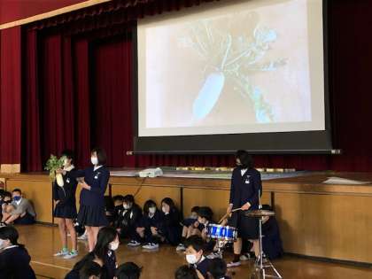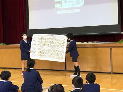 今日の児童集会では、美化栽培委員会によりクイズ形式での発表をしてくれました。鷹合学習農園で収穫したいろいろな野菜について、大画面のスライドやドラムを使い、楽しく、ためになる発表でした。各なかよし班では、相談しながら真剣にクイズの答えを考えていました。