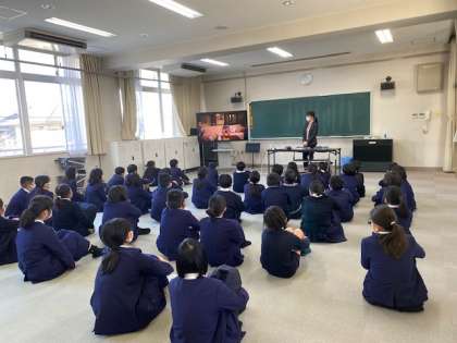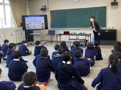 いろいろな事例を分かりやすく映像で見せてもらいながら、どうしたら犯罪に巻き込まれたり、友達を傷つけたりしないかについて学びました。LINEなどによる友達どうしのトラブルは、社会問題になっています。本校では、毎年5年生にこの出前授業で学んでもらっています。5年生だけではなく、4年生から繰り返し学習を積み上げています。