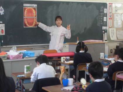 歯科衛生士の先生方に来校いただき、2年生を対象に歯磨き指導を行いました。