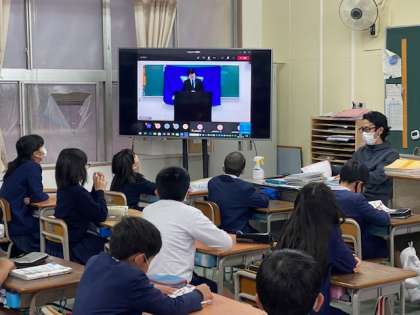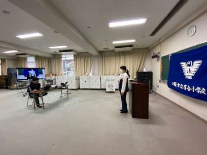 本日の児童朝会もリモートによる実施です。校長先生からは「あいさつ週間」についてのお話がありました。