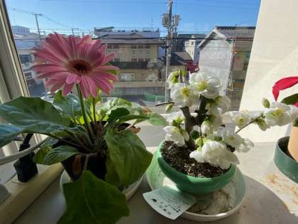 本日の給食の写真を撮り忘れたので…、職員室窓際の鉢植えの写真を載せます。ガーベラとボケの花です(^O^) 春はすぐそこですね(^O^)
