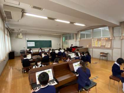3組は、音楽室のアンサンブルオルガンを使って、「こいぬのマーチ」を弾く練習です。運指も間違わないで、弾く練習をしていました。コロナさえなければ、鍵盤ハーモニカで演奏できるのですが。笠井先生もピアノをがんばってました(^O^)
