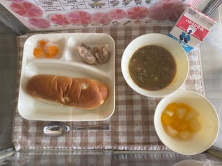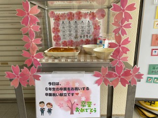 中学校の卒業式との兼ね合いで、卒業お祝い献立が例年より早い日の設定となっています。近江牛🎵のカレーシチューが、うれしかったです(^O^)