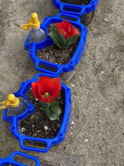 春らしいうららかな陽光が、1年生が植えているチューリップに降り注ぎ、開花が始まりました(^O^)