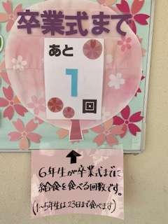 卒業生が給食を食べる日のカウントダウンなのですが、在校生も給食が終わりだと考えていたようです(^O^) 在校生は、来週の火曜日まで給食がありますよ。