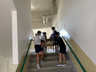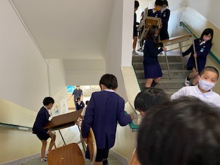 現4年生の教室の耐震工事が終了しました。今使っている、中学年用の机を元の教室に戻しました。