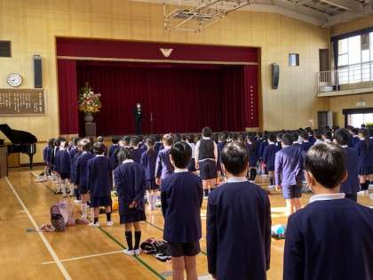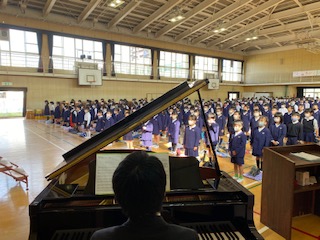 始業式が始まりました。津村先生のピアノを聴きながら、心の中で一生懸命に校歌を歌っている様子が伝わってきました。