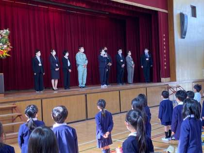 校長先生のお話に続いて、新転任の教職員の紹介がありました。コロナ感染予防対策のため、「よろしくお願いします」と小さな声で、ご挨拶をしていました。