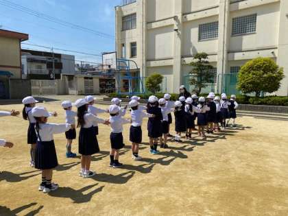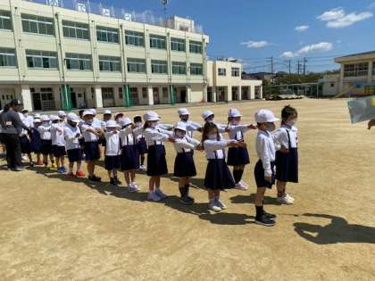 運動場で「保健室へ行くときの2列の並び方」を今日は覚えました。