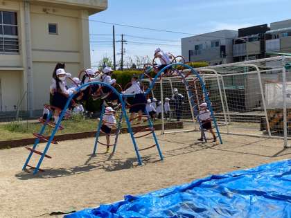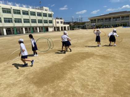 「先生、ほら見て!」と、フープを走らせて取りにいくところや、竹馬に挑戦するところを見せてくれました(^O^)