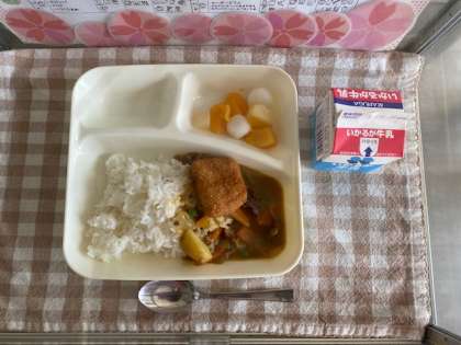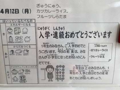 「入学祝い献立」でした。1年生は、カレーライス大好き!という様子でしたが、白玉は、「これ何?」と不思議そうでした(笑)
