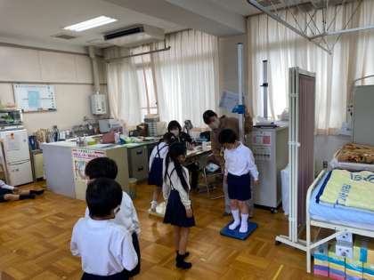 今日は、1年生の発育測定の日です。名前の順番で2列に並び(人数が多いので、なかなか大変です(;^_^A)、そのまま保健室に移動して、名前の順番で座っていきます。