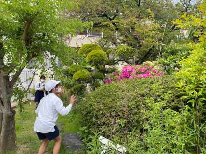 野草園で「ツツジ」「リンゴの花」「まだ青いビワの実」「サクランボ」「アブラムシ」「タンポポの綿毛」「モンシロチョウ」「シジミチョウ」などを発見していました。