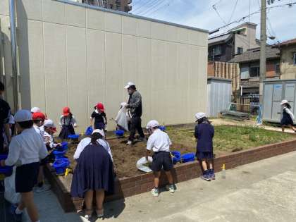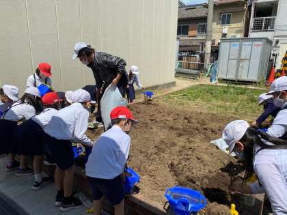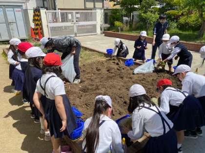 ミニトマト、サツマイモ、オクラ、エダマメなどを植えます。一人一鉢で「ミニトマト」、一人一袋で「サツマイモ」を育てる予定です。