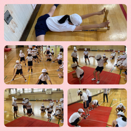 5年生の「反復横跳び」「長座体前屈」「立ち幅跳び」の様子です。