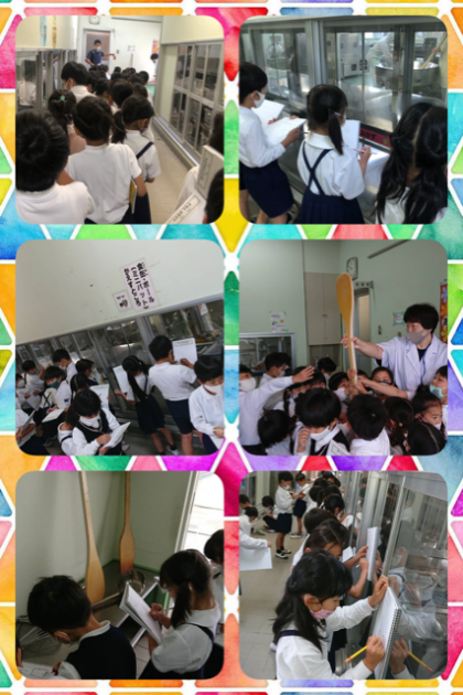 今日は給食室を見学させてもらいました。栄養教諭の松坂先生に、「とんなおしごとをしているのですか」と大きな声で質問しました。